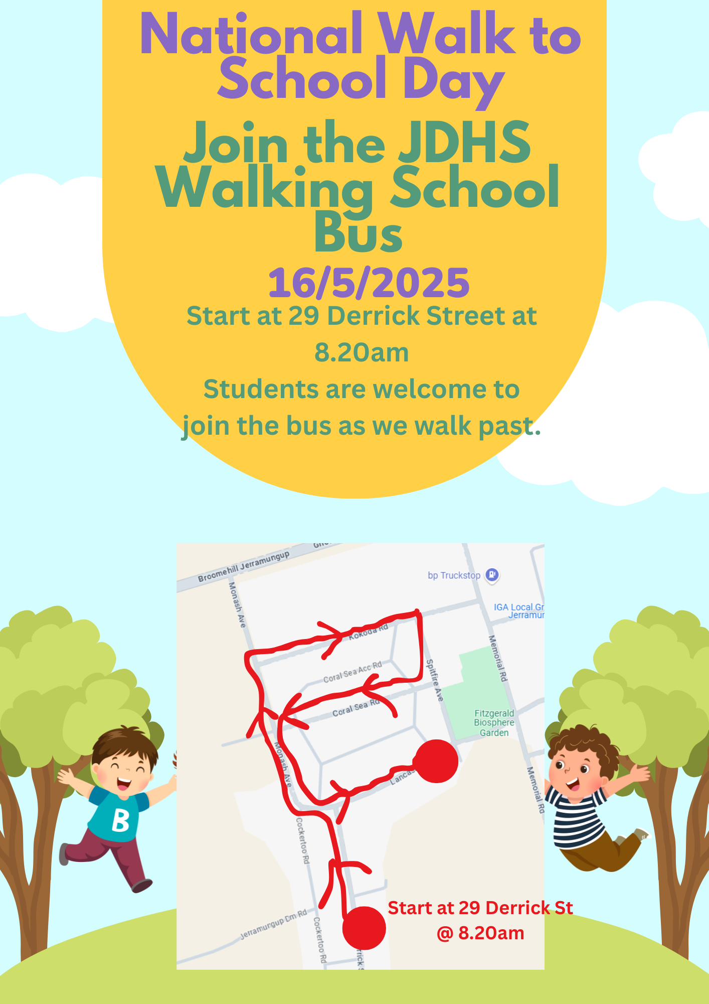 Jerramungup DHS will be doing a walking school bus on 16/5/2025 for National Walk to School Day.